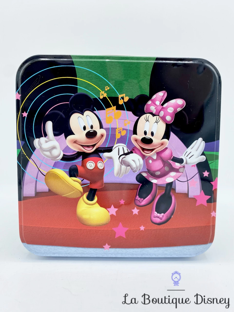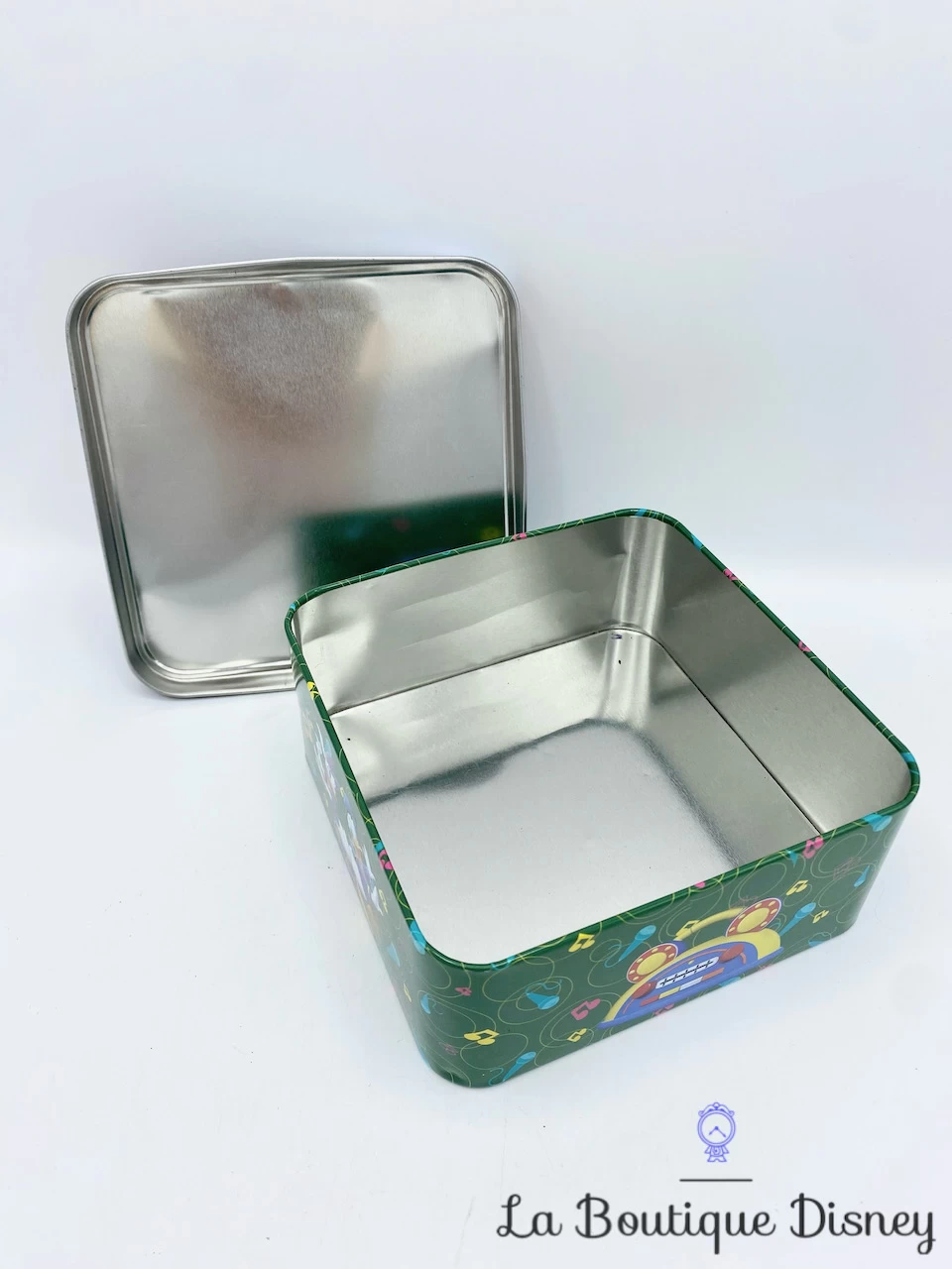 Boite en métal carrée verte et rouge représenant Mickey et Minnie en train de s’amuser sur une piste de danse. Ils sont entourés de notes de musique et d’étoiles. Autour de la boite, sur fond vert, il y a divers éléments qui font penser à la Maison de Mickey comme un lecteur de musique avec des micros, une paire de chaussures bleue ou encore Donald et Daisy en train de danser. Intérieur argenté.