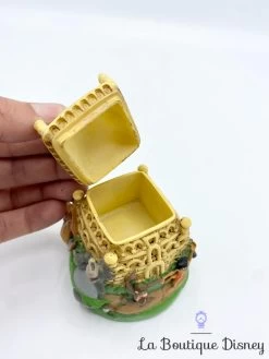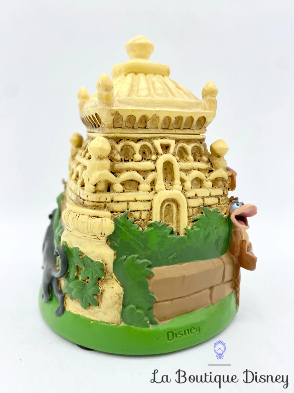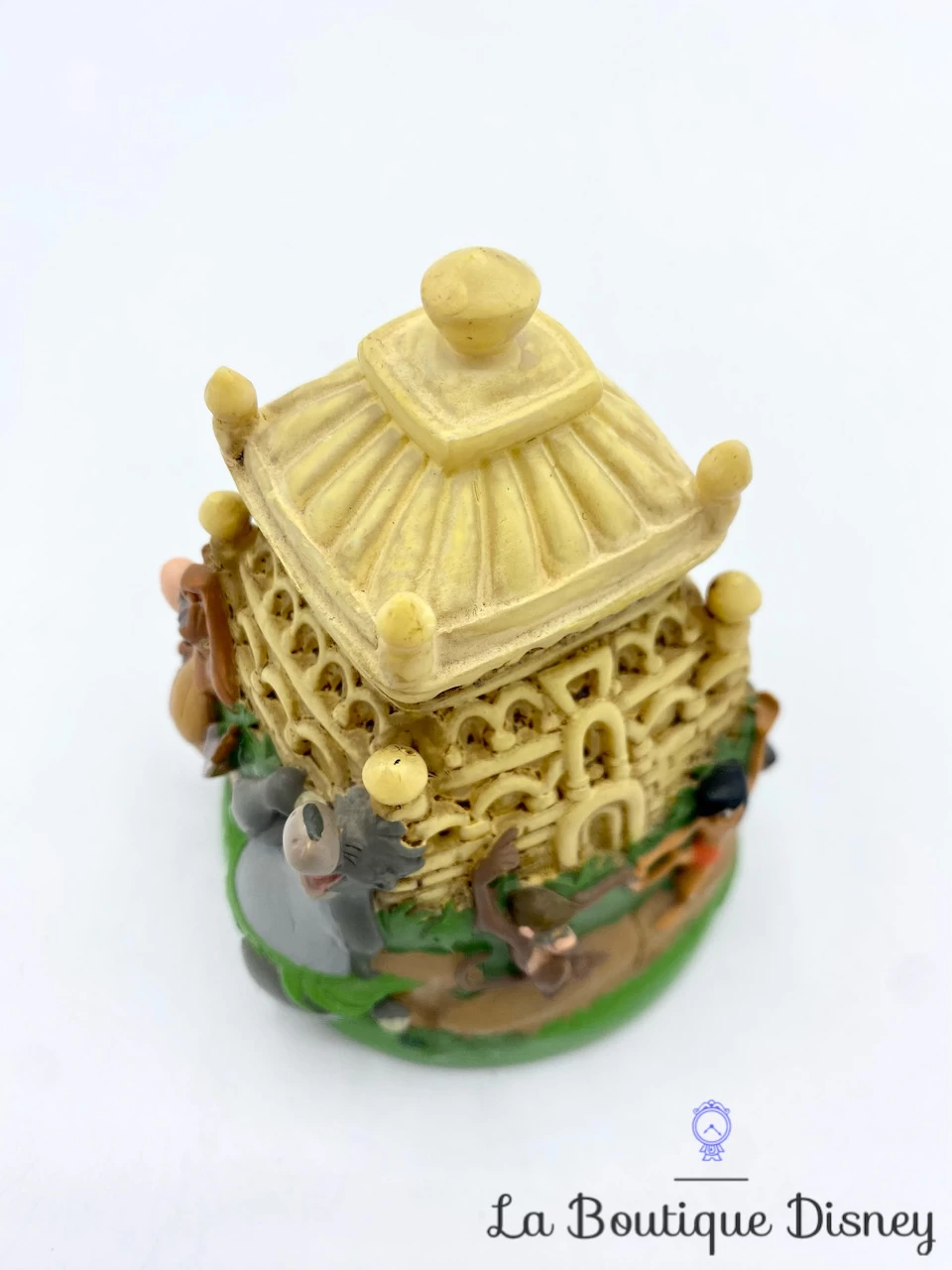 Boite en rĂ©sine petit format, style « boite Ă dent » sur le thème du dessin animĂ© Le livre de la jungle. La boite reprĂ©sente un temple / palais indou. Devant le palais, se trouvent les personnages Mowgli et d’un singe. Ă€ l’arrière se trouvent Baloo avec des feuilles en train de danser, le Roi Louis et Bagheera la panthère noire. Le dessus du temple s’ouvre et forme le couvercle de la boite.Â