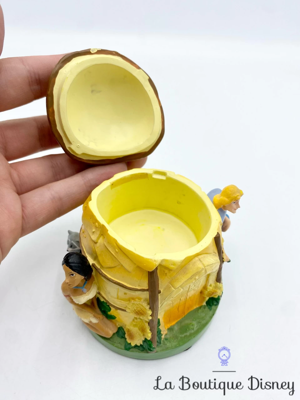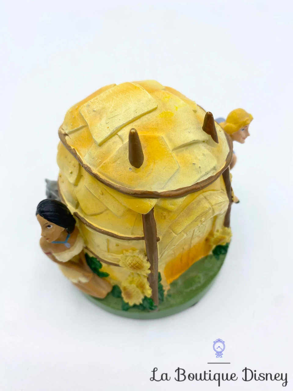 Boite en rĂ©sine petit format, style « boite Ă dent » sur le thème du dessin animĂ© Pocahontas. La boite reprĂ©sente une hutte indienne jaune. Devant la hutte, se trouvent les personnages de Pocahontas et John Smith tenant un tournesol Ă la main. Ă€ l’arrière se trouve le petit raton laveur gris Meeko. Le dessus de la hutte s’ouvre et forme le couvercle de la boite.Â