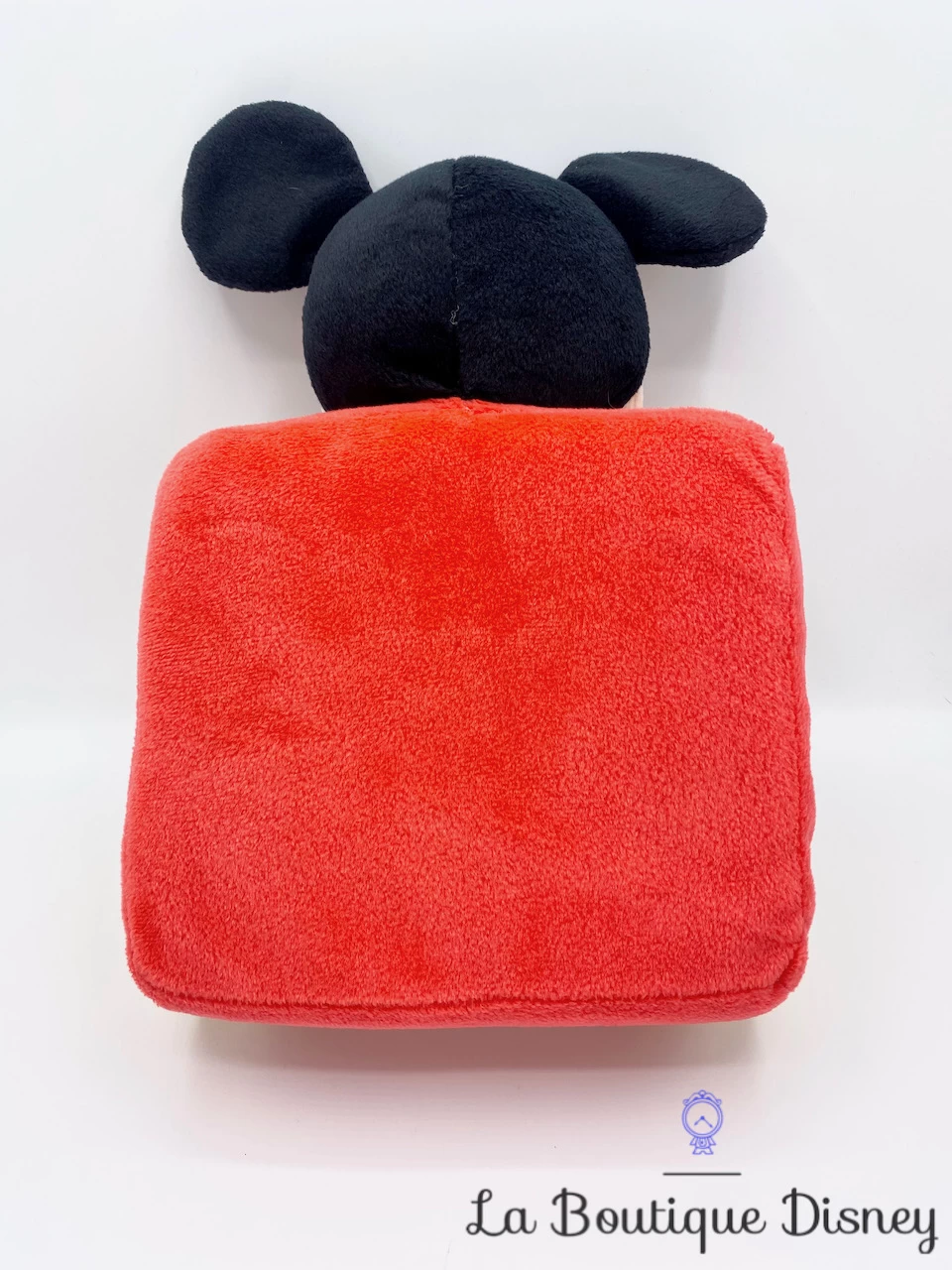 Cadre photo en matière peluche carré rouge. Le cadre a la forme du corps de Mickey, avec sa tête et ses oreilles noires, ses gants blancs et ses chaussures jaunes. Sur le cadre, broderie « Mickey » multicolore. Espace rond pour y insérer la photographie de votre choix !