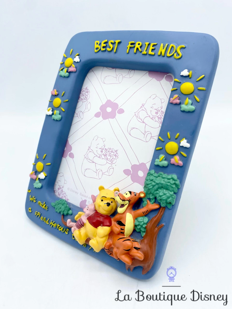 Cadre en rĂ©sine peint en bleu sur le thème de Winnie l’ourson. Vos trois personnages prĂ©fĂ©rĂ©s sont prĂ©sents en bas du cadre : Winnie l’ourson est assis sur un tronc d’arbre en compagnie de Porcinet le petit cochon rose et de Tigrou le tigre orange de la forĂŞt des RĂŞves bleus. Sur la partie haute, il y a une inscription en jaune « Best Friends » puis sur le bas « We make Ă splendiferous team ! ». Des petits soleils avec des nuages verts, blancs et rose viennent se rajouter Ă la dĂ©coration. Cadre de table tenant debout grâce Ă un petit chevalet Ă l’arrière. Format de la photographie Ă insĂ©rer : 9×13 cm.