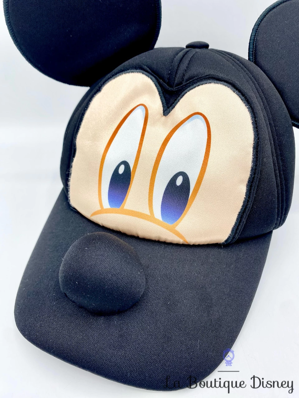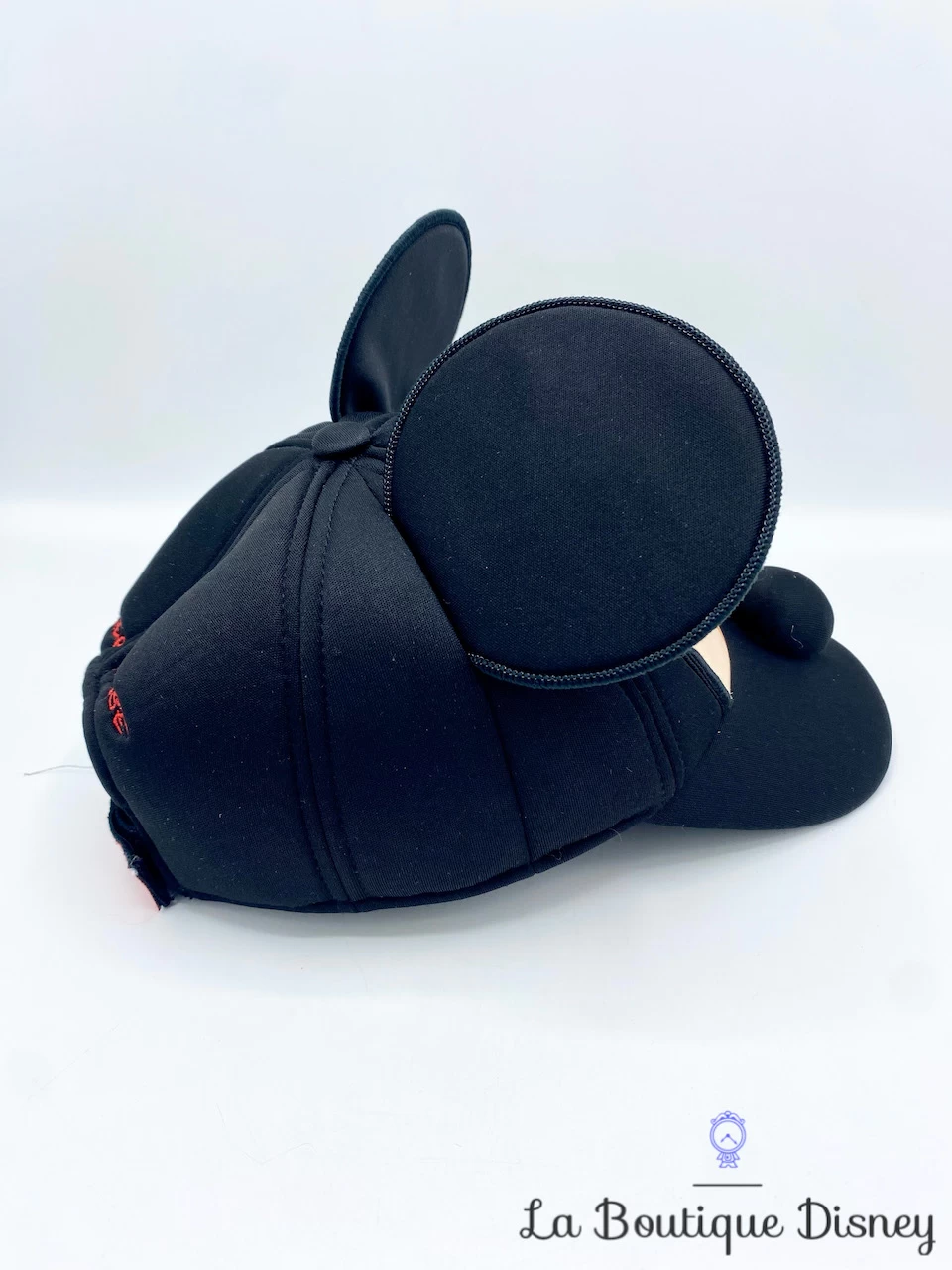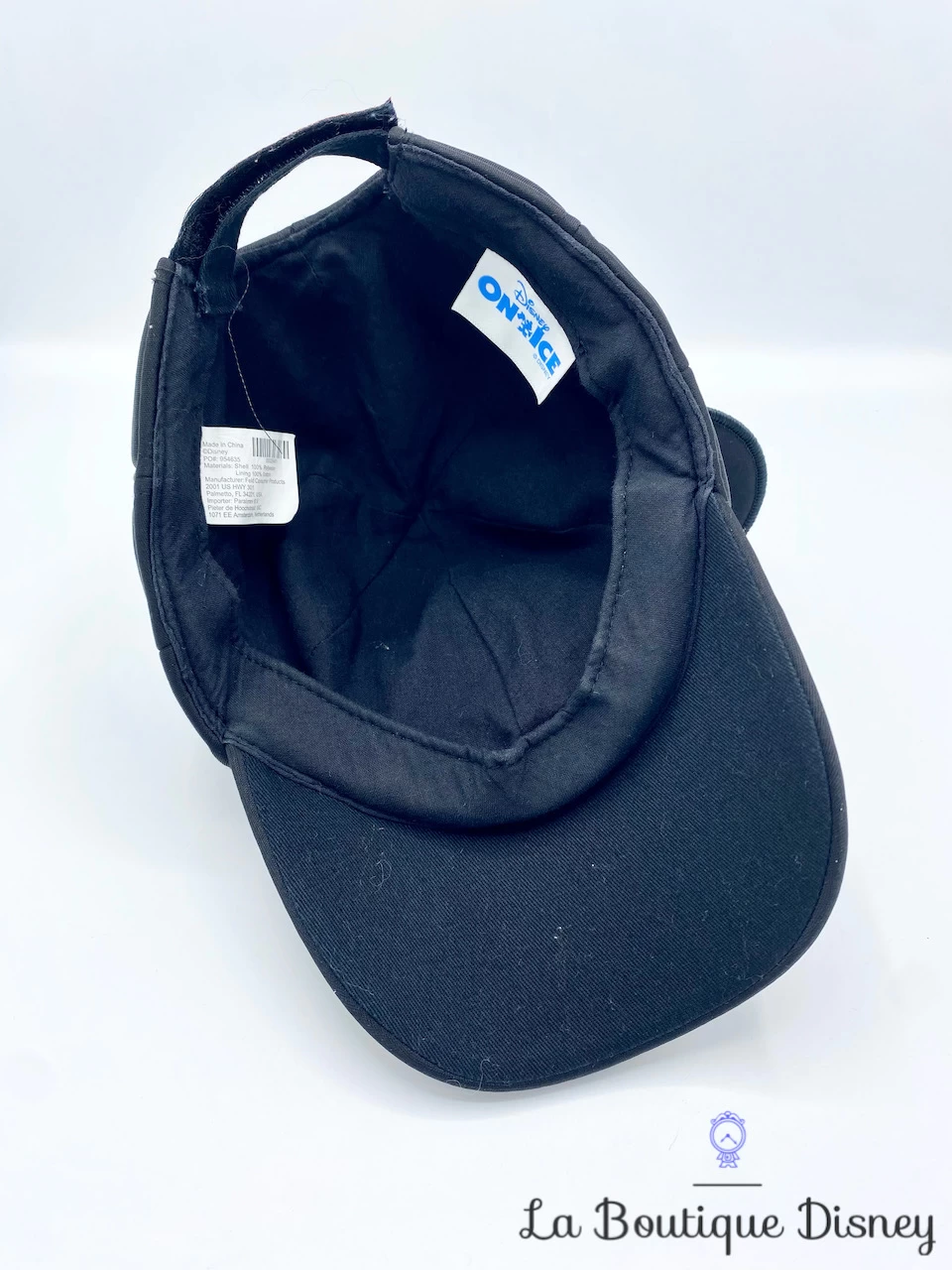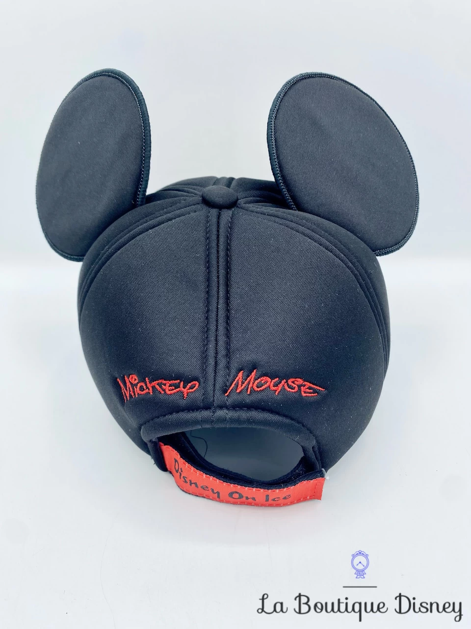 Casquette noire en tissu Ă©pais rembourrĂ© avec sur le devant le visage de Mickey Mouse. Il y a les deux oreilles et le nez de Mickey en relief. Taille rĂ©glable à l’arrière par un scratch rouge sur lequel est inscrit « Disney On Ice ».Â