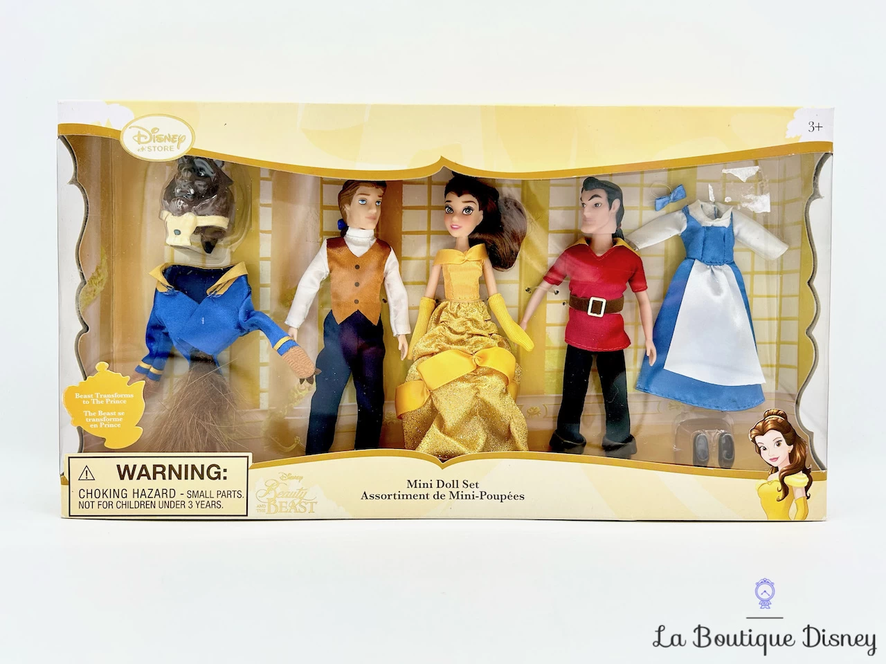 Ensemble de trois mini poupées Disney avec la princesse Belle dans sa robe de bal jaune, la Bête en prince et Gaston. Sont également inclues deux tenues à savoir celle de Belle en villageoise dans sa robe bleue et la tenue et le masque de la Bête. Bras, jambes et tête articulés.