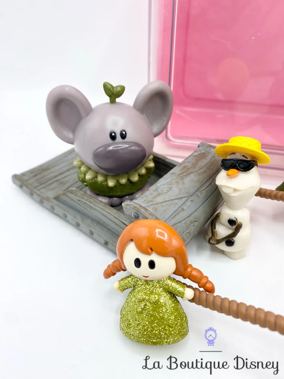 Ensemble de jeu avec Mini Poupée en plastique représentant la princesse Anna. Coffret de 8 pièces inspirées du film La Reine des neiges : petite poupée, mini peluche, Sven, traineau, Olaf, carottes et deux trolls. Anna a une chevelure rousse très réaliste avec deux couettes, elle porte sa robe verte pailletée avec petites chaussures noires. Sa tête, ses bras et ses jambes sont articulées. La petite valise transparente et rose a une poignée de transport à paillettes pour pouvoir emmener votre nouvelle poupée partout avec vous !