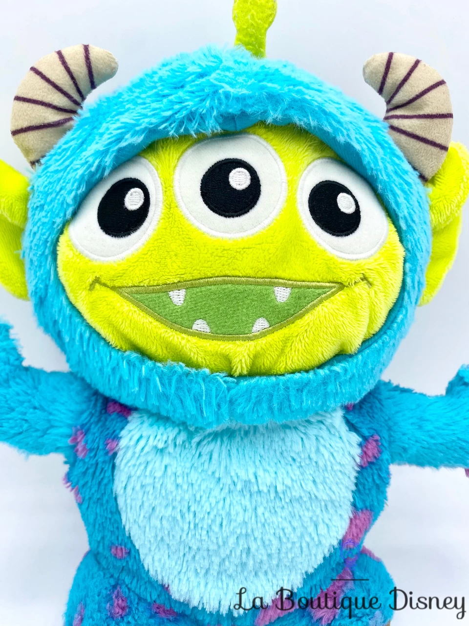 Peluche du cĂ©lèbre petit extraterrestre vert Alien dĂ©guisé avec une combinaison de Sulli, le gentil monstre bleu Ă tâches violettes. Il est la Terreur d’Ă©lite de Monstres et Cie avec ses deux petites cornes et ses griffes marrons. Alien a 3 grands yeux noirs brodĂ©s, une bouche verte brodĂ©e avec des petites dents blanches.Â