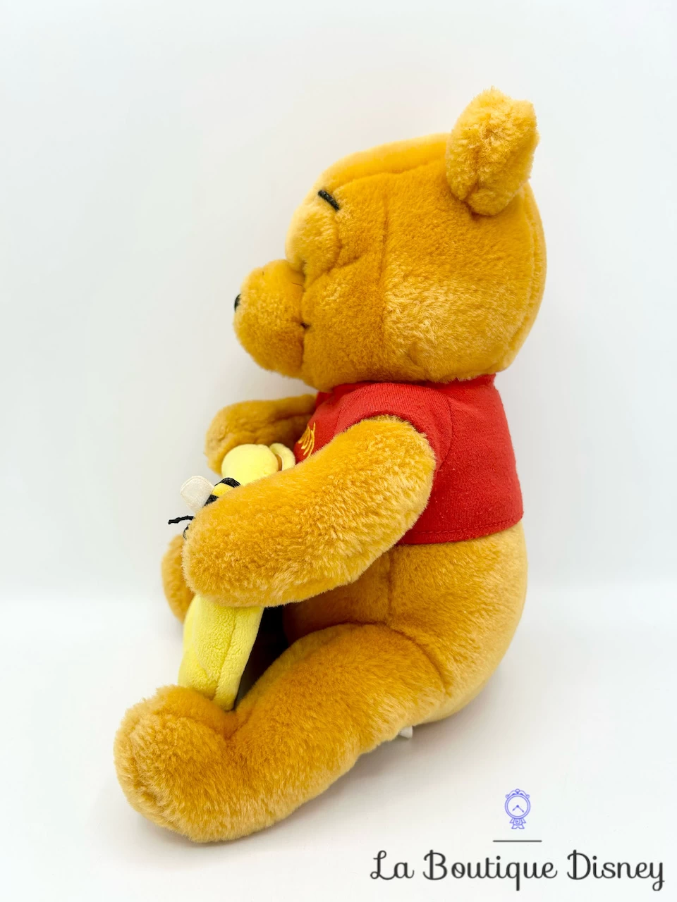 Peluche reprĂ©sentant Winnie l’ourson en position assise tenant un cadre jaune dans ses pattes avec une abeille posĂ©e dessus. Il a son tee-shirt rouge habituel avec une inscription brodĂ©e en jaune « Pooh ». Museau et cils en feutrine noire Ă©paisse, yeux en plastique.