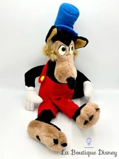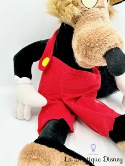 Peluche du Grand MĂ©chant Loup du dessin animĂ© Les trois petits cochons. Il porte une grande salopette rouge et un grand chapeau bleu. Il a un long museau, des petites oreilles et des yeux noirs en plastique dur.Â