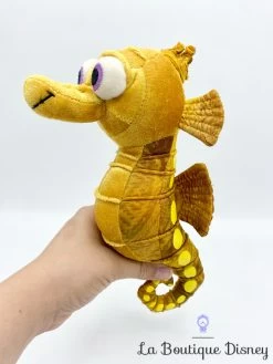 Peluche de Hippo ou Sheldon en version originale, le petit hippocampe allergique Ă l’eau de mer. Il se lie d’amitiĂ© avec NĂ©mo lors du premier jour d’école. C’est un hippocampe jaune et marron avec des yeux violets et des tâches jaunes.Â