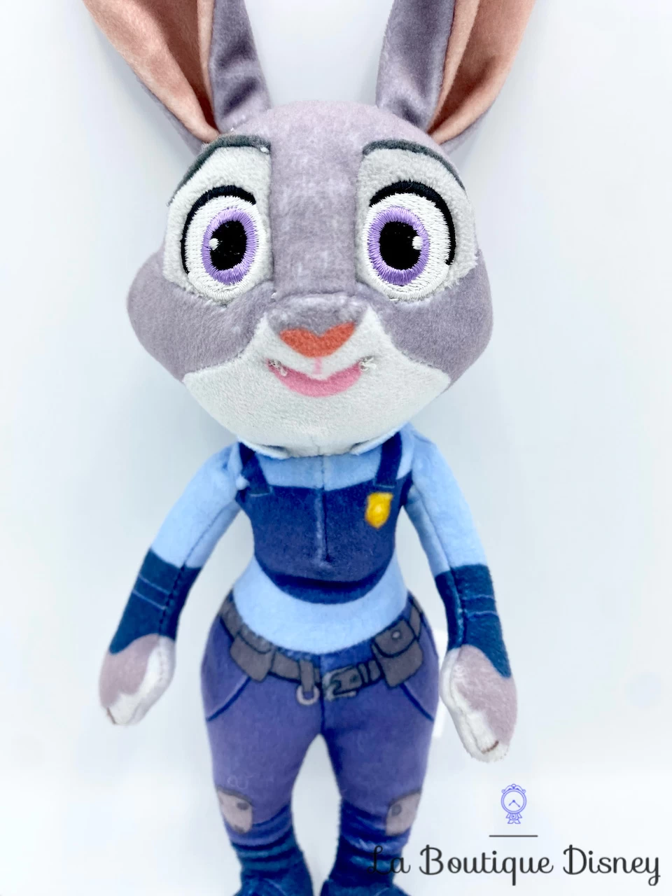 Peluche de Judy, la jeune lapine qui rĂŞve depuis son plus jeune âge de devenir policière malgrĂ© sa petite taille. Judy est un lapin aux poils gris. Le bout de ses oreilles est de couleur rose. Elle a les yeux violet et la truffe rose. Elle est ici habillĂ©e avec son uniforme de police bleu qui s’adapte parfaitement Ă son corps de lapin.Â
