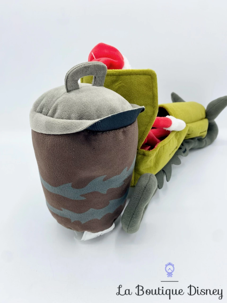 Peluche toute douce de Mr Jack, le squelette épouvantail blanc de la ville d’Halloween. Il est habillé d’un costume rouge et blanc de Père Noël. Il est aussi appelé le roi des citrouilles. Il est assis dans un grand traineau vert et gris, prêt à remplacer le « Perce-Oreille » !