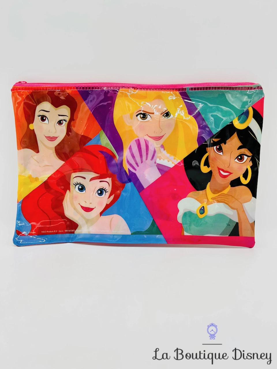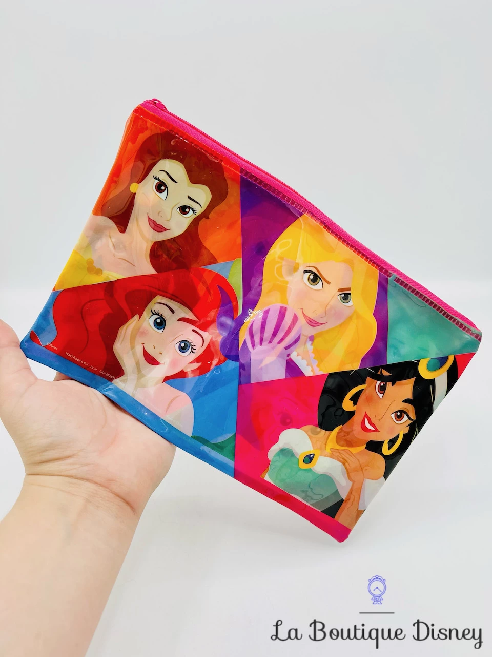 Trousse rose effet « plastique » avec sur le devant le portrait de quatre princesses à savoir Ariel, Belle, Jasmine et Raiponce. Fermeture éclair rose. Pochette très colorée idéale pour y ranger vos petites affaires scolaires ou même du maquillage.