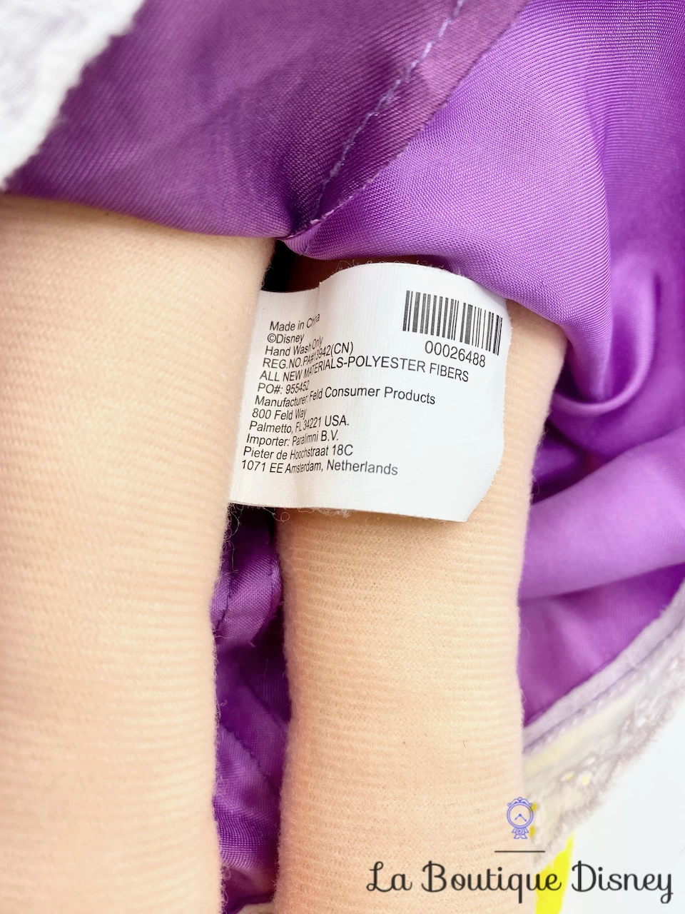 Peluche de la princesse Raiponce vĂŞtue d’une robe violette / mauve rĂ©haussĂ©e de manches bouffantes rayĂ©es roses, de rubans et de bordures en dentelle ainsi que d’une jupe satinĂ©e scintillante mauve et d’un corset Ă lacets. Merveilleusement douce, les traits de son visage sont brodĂ©s et elle a de grands yeux verts. Sa longue chevelure blonde sĂ©duira tous les enfants ! En fibre polyester.