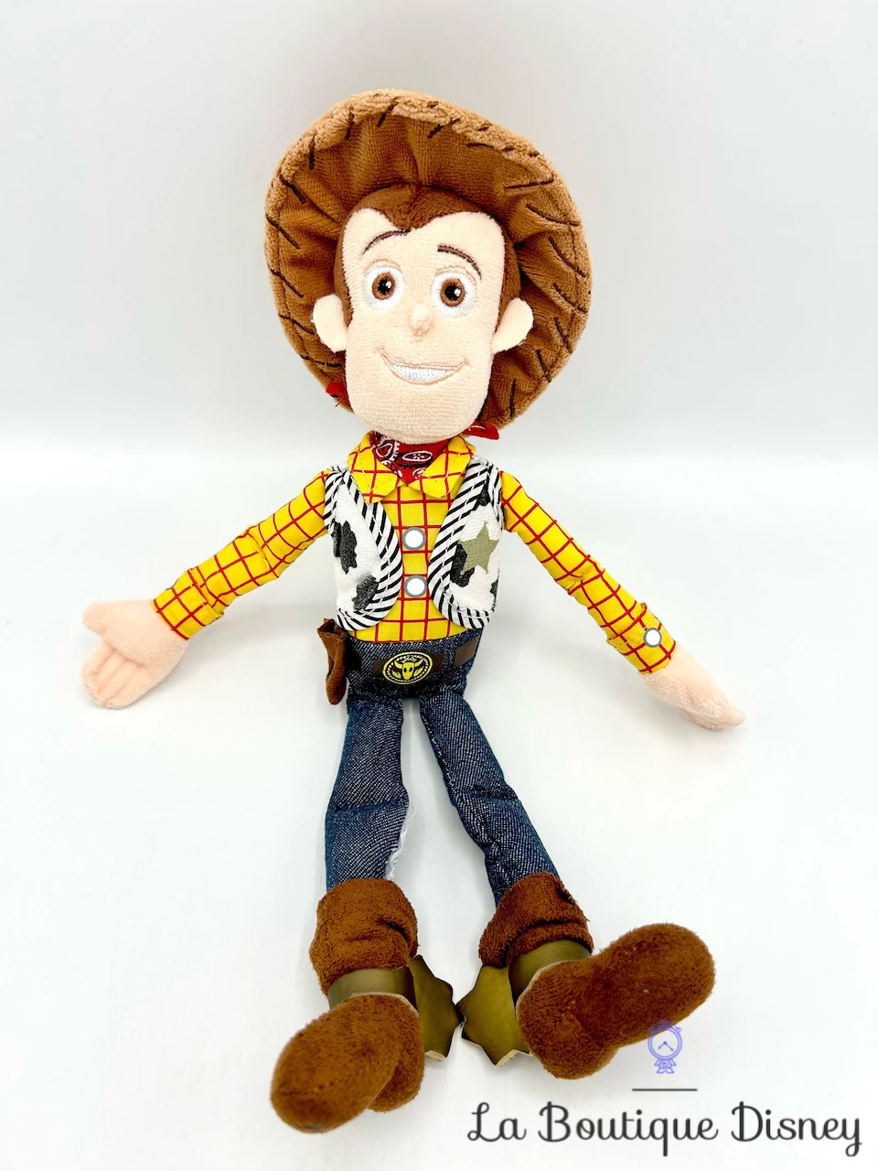 PoupĂ©e chiffon du cĂ©lèbre cow boy en jouet, Woody. Il est vĂŞtu de sa chemise jaune Ă carreaux de shĂ©rif, son jean bleu et sa ceinture marron. Il porte des grandes bottes marrons avec le prĂ©nom de son enfant prĂ©fĂ©rĂ©, Andy notĂ© en dessous. Woody a Ă©galement sur sa tĂŞte son chapeau marron. Son corps est mou en matière chiffon ainsi que sa tĂŞte, ses mains et ses bottes. Il est prĂŞt Ă partir Ă l’aventure avec son fidèle ami Buzz l’Ă©clair !