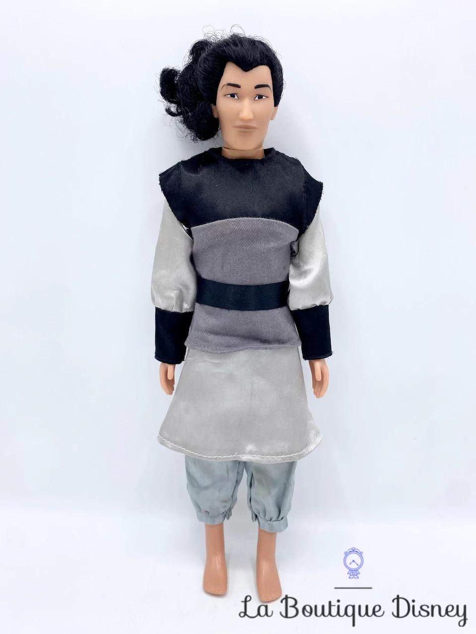PoupĂ©e en plastique du guerrier capitaine de l’armĂ©e chinoise Li Shang, l’amoureux de la princesse Mulan. Il porte une tenue en satin grise et noire. Il a des cheveux noirs attachĂ©s en queue de cheval. Bras, jambes et tĂŞte articulĂ©s.Â