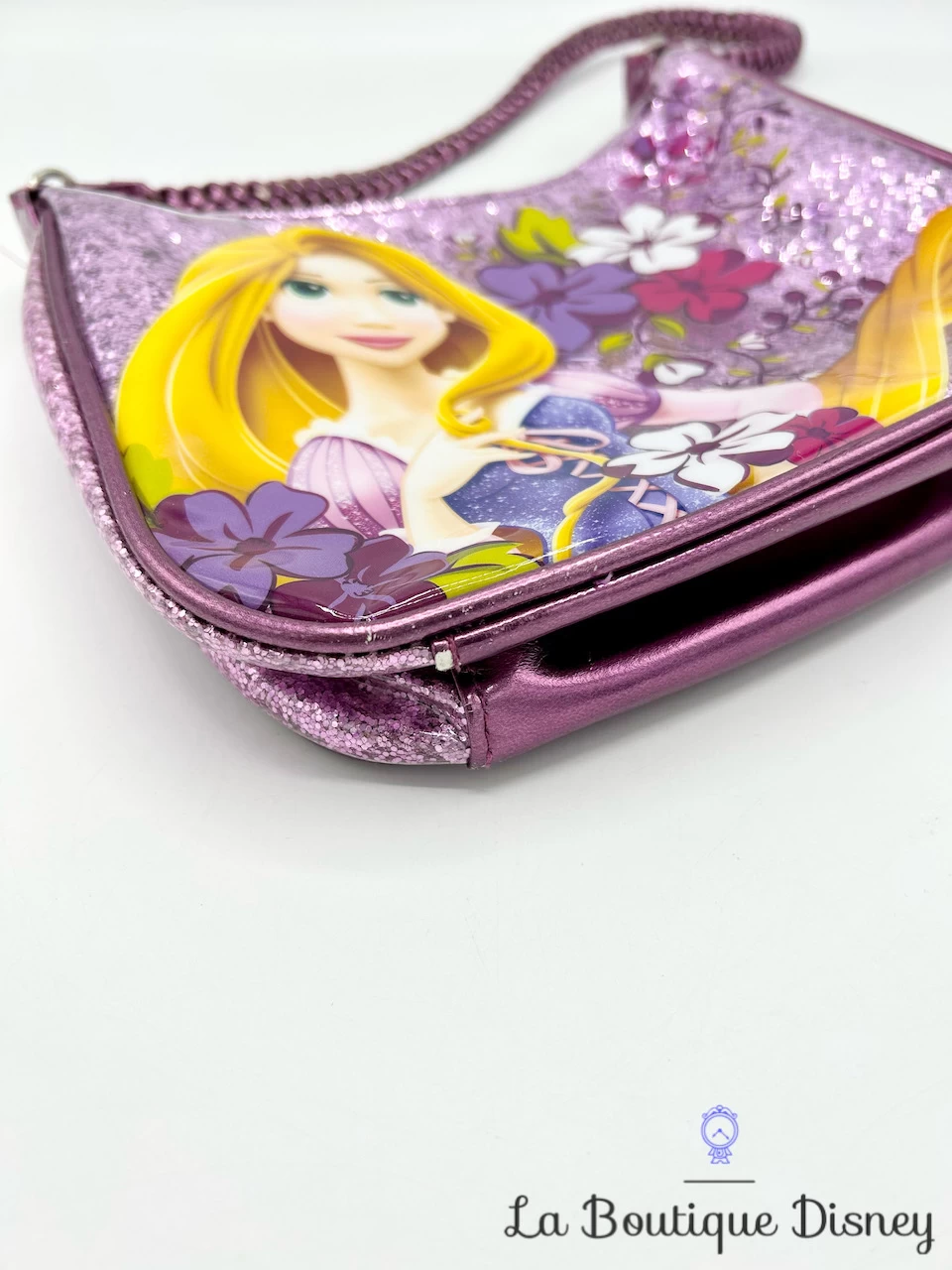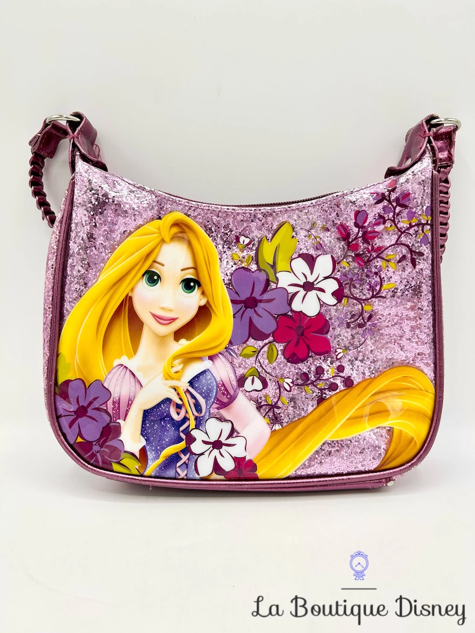 Petit sac à main violet de la princesse Raiponce. Motif effet plastifié avec la princesse sur le devant entourée de fleurs et de nombreuses paillettes violettes. Fermeture éclair. Petite bandoulière tressée violette. Intérieur du sac doublé d’un tissu violet. Ce petit sac à main sera parfait pour agrémenter vos tenues déguisements de Raiponce !