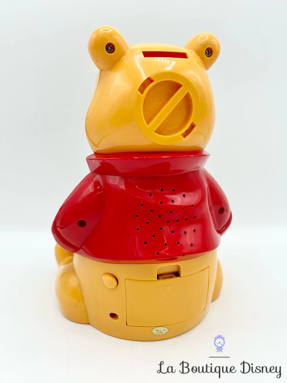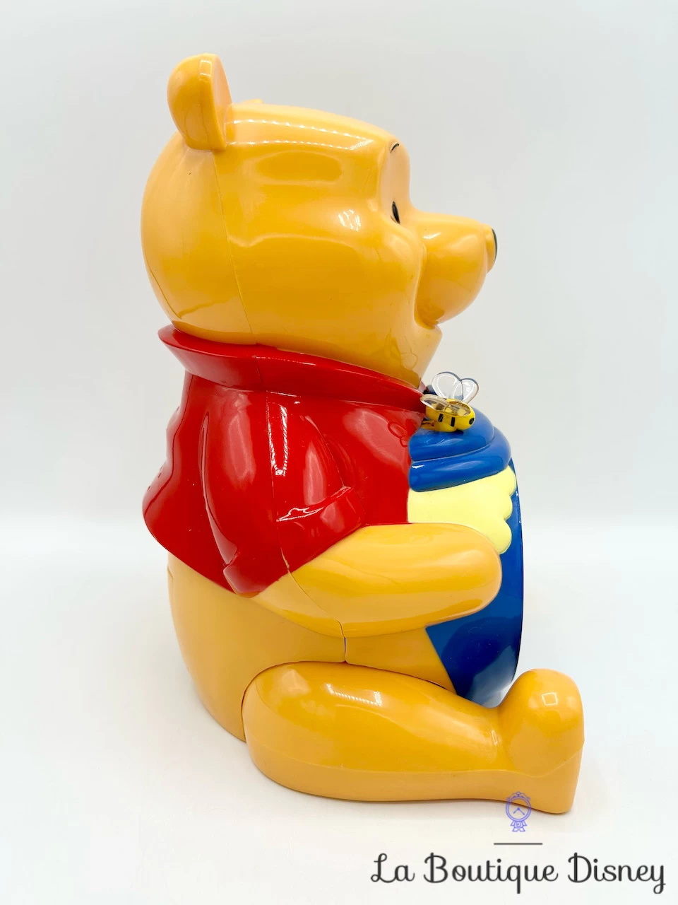 Tirelire en plastique reprĂ©sentant le cĂ©lèbre ourson mangeur de miel, Winnie l’ourson. Il est assis et tient entre ses deux mains un Ă©norme pot de miel jaune et bleu. Fente sur le dessus de sa tĂŞte pour y insĂ©rer la monnaie. Bouchon rĂ©cupĂ©rateur derrière la tirelire. Sur le devant du pot de miel, prĂ©sence d’un petit rĂ©veil avec en arrière plan une image de Winnie essayant d’attraper un papillon ainsi que l’inscription « Winnie the Pooh ».Â