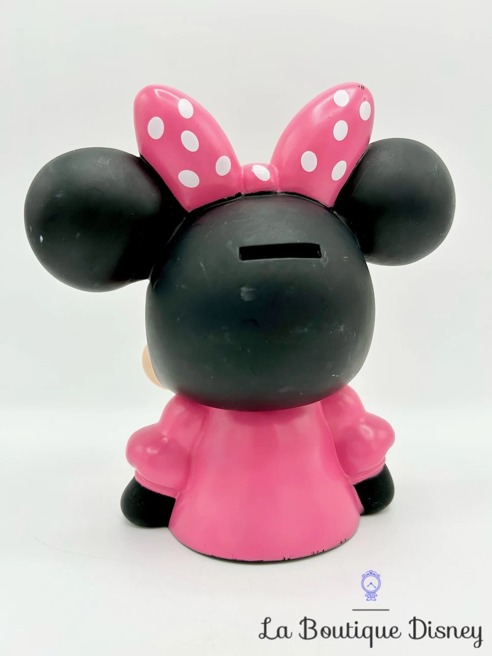 Tirelire en plastique dur reprĂ©sentant le buste de la cĂ©lèbre souris Minnie Mouse. Elle porte un haut rose et un noeud rose Ă pois blancs. Une fente est situĂ©e sur l’arrière de la tirelire pour y insĂ©rer la monnaie et il y a un bouchon rĂ©cupĂ©rateur en dessous.